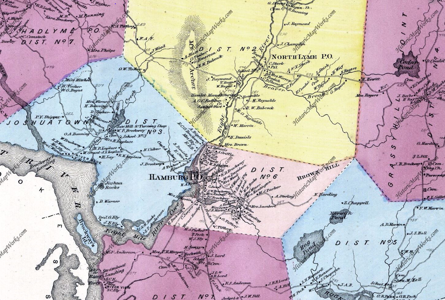 “John Butler (born at Chebacco in 1708), third and youngest child of Lieut. William and Mary (Ingalls) Butler, grew to manhood in the town of Ipswich, where he was married in January, 1730, to Hannah Perkins. In 1732 John Butler and his wife and their only child, accompanied by James Perkins – a brother of Mrs. Butler – removed from Ipswich to Lyme, New London County, Connecticut. Lyme, which was originally a part of Saybrook, now covers some seven or eight miles square of territory, bounded on the west by the Connecticut River and on the south by Long Island Sound. …. John Butler and James Perkins settled within the bounds of the North Society of Lyme, not far from the present village of Hamburg, and later Mr. Perkins became a Deacon in the Congregational Church there. At the time of their settlement they jointly purchased 290 acres of land back of Mount Archer, in the direction of the district known as Joshuatown – the north-westernmost section of Lyme, which has, from the first, borne this name, derived from Joshua, the third son of Uncas the noted sachem of the Mohegans (mentioned on page 196), who was once the lord and tenant of that rough and romantic region. About 1786 Messrs. Butler and Perkins bought in common other lands in Lyme, and in January, 1739, they made an amicable division of all their Lyme lands. In the Spring or Summer of 1755 John Butler died at Lyme, being survived by his wife, Hannah, and nine children, the youngest of whom was only three years of age. The inventory of John Butler’s estate – the bulk of which was in lands – amounted to £6,403, 8sh., in ‘money of the old tenor’ “